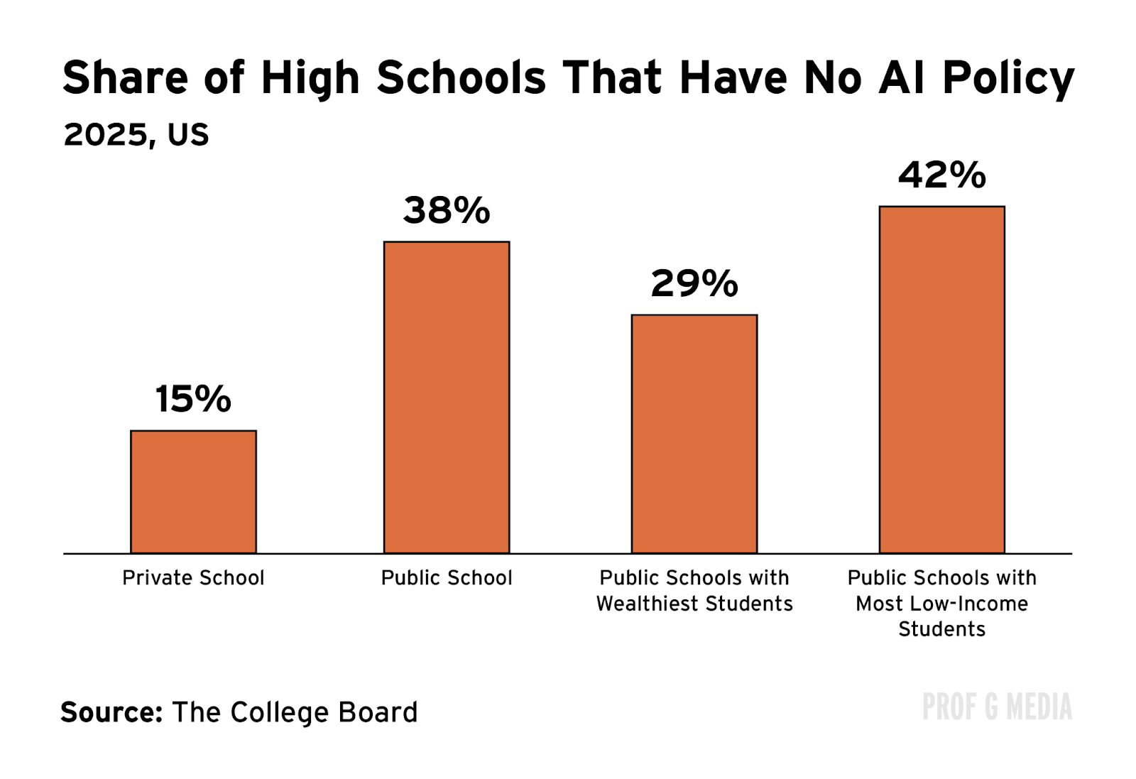 The disadvantages of AI will be distributed unequally. Private schools are more than twice as likely to both permit GenAI use and have policies governing it. Among public schools, those serving more low-income students are least likely to have such policies in place. These differences threaten to exacerbate already bad wealth-based achievement gaps.