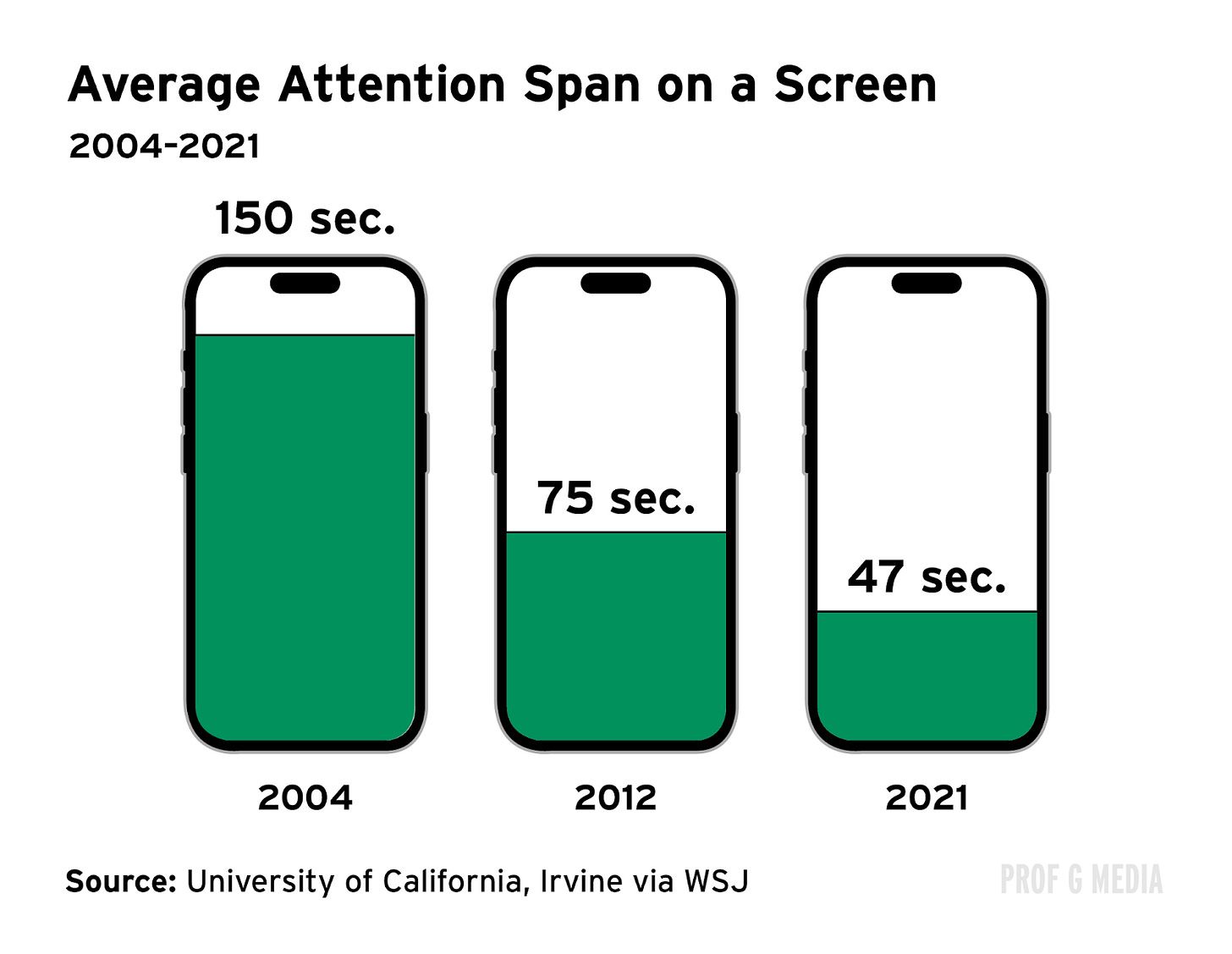 Smartphones only made our attention problem worse by giving us access to unlimited information and reminding us of it 146 times per day, on average. Now, 60% of teens go on their phones while watching TV.
