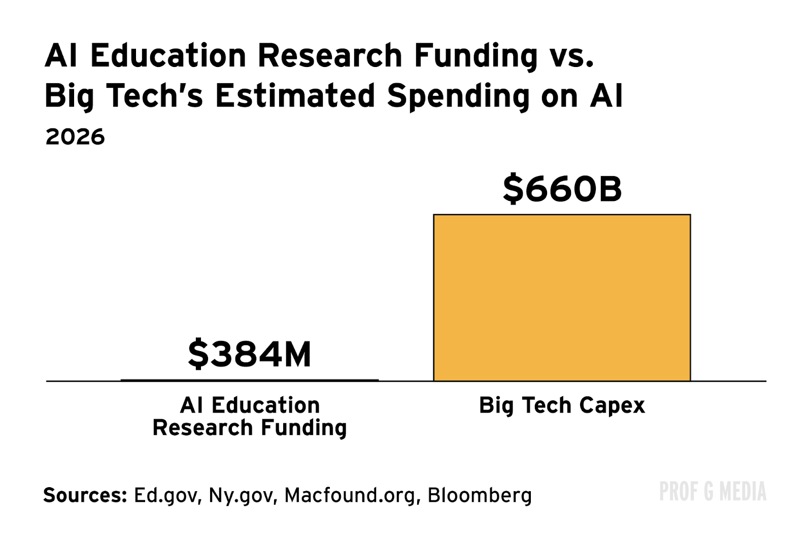 As much as we’d like companies to self-regulate, we know they don’t. Our elected representatives need to step in — but they’re not. How many laws have been passed? Only two — Tennessee and Ohio both passed legislation requiring school districts to develop their own AI policies. How much money is being spent on studies investigating AI’s impact on learning?