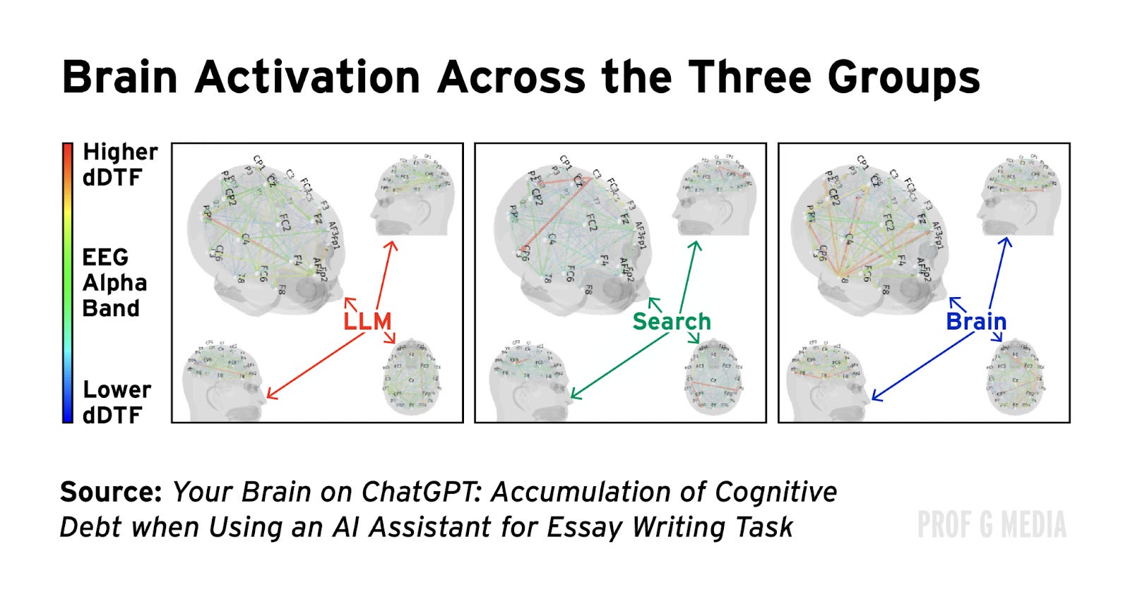 Researchers had students write essays using a search engine, a large language model (LLM), or nothing. The group writing with the LLM had 55% reduced brain activity and wrote essays that lacked creativity and were largely judged to be “soulless.”