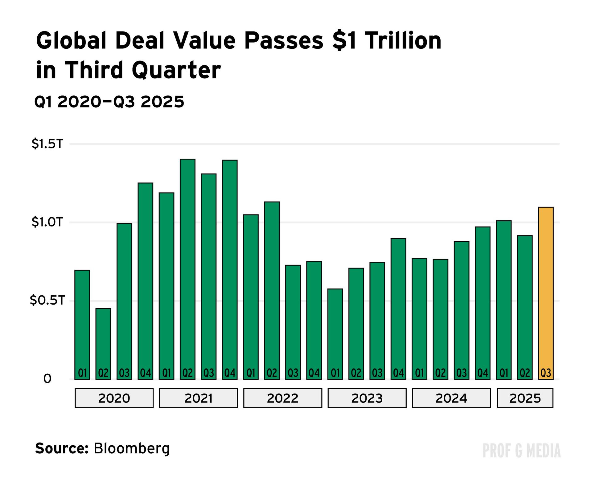 Global M&A activity is rebounding … sort of. Global deal values hit $1 trillion in a third quarter for only the second time ever. But the headline numbers obscure a concerning trend. While deal value increased 40%, deal volume declined 16%. Translation: Big deals are back, but small ones are vanishing. In the first half of the year: