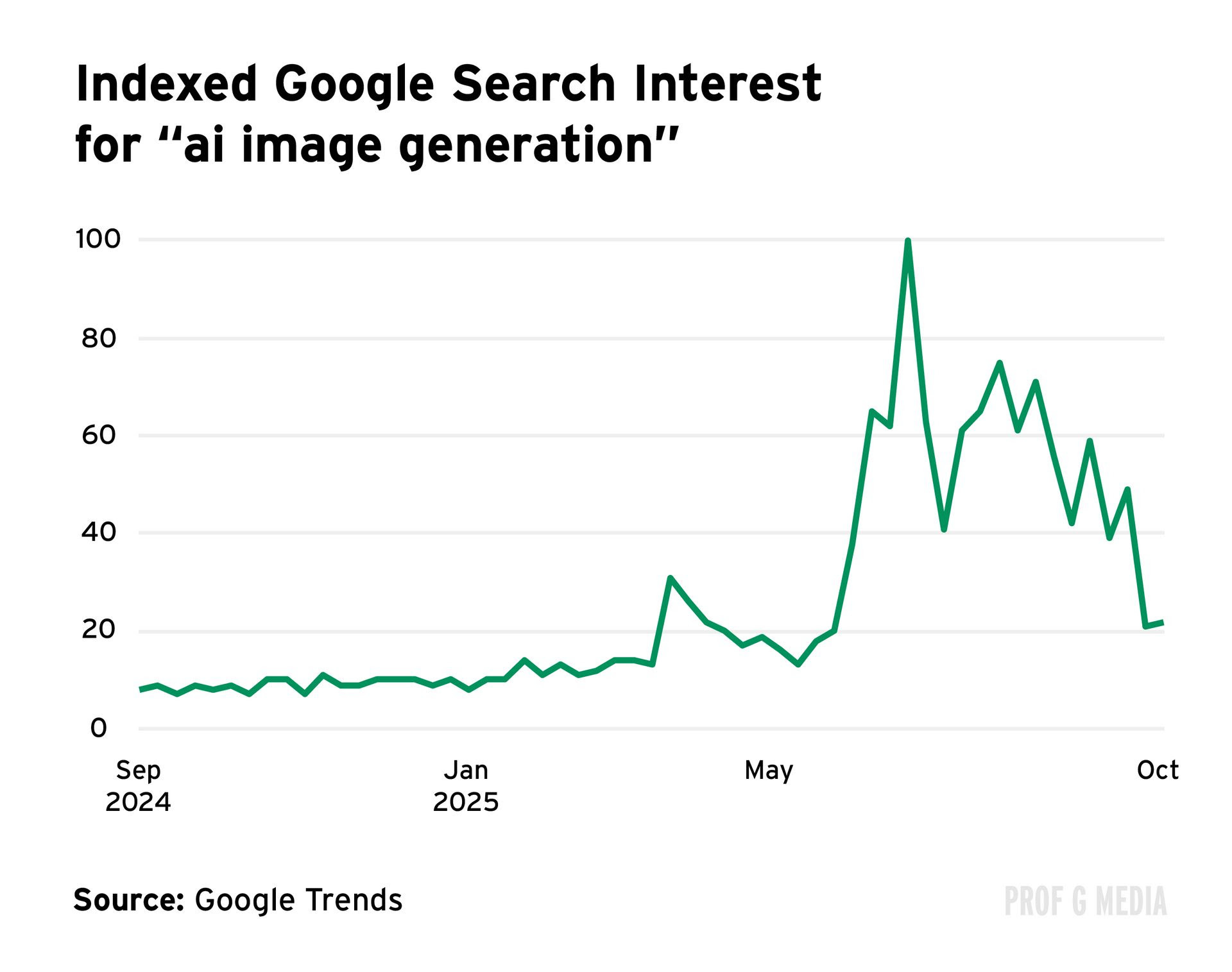 Ever since ChatGPT image generation was released in 2022, Google search interest for AI image generation has fallen nearly 80%. Another study showed AI art in Reddit communities has plummeted.