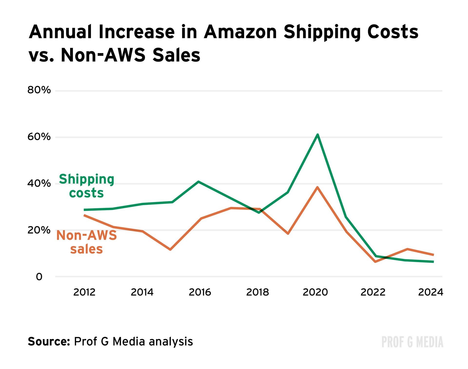 Historically, Amazon’s margin expansion has been powered by ads and AWS. Now retail is contributing. For over a decade, fulfillment and shipping costs ballooned more quickly than sales. That reversed two years ago; retail sales are now growing faster than shipping costs, suggesting robotics is finally delivering operational leverage.